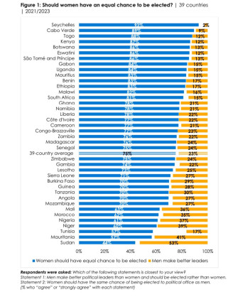 On average across 39 African countries, a sizeable and (slowly) growing majority (75%) of citizens say women should have the same chance of being elected to public office as men (Figure 1).
