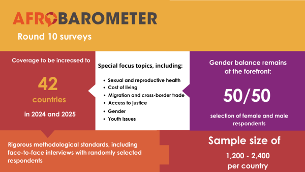 The latest round introduces a broad scope of special focus topics, including sexual and reproductive health, cost of living, migration and cross-border trade, access to justice, gender, and youth issues, which will complement Afrobarometer’s flagship topics of democracy, governance, and economic well-being.