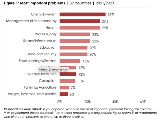 On average across 39 countries surveyed between late 2021 and mid-2023, unemployment and management of the economy top the list of the most important problems that Africans want their government to address, along with health (Figure 1).