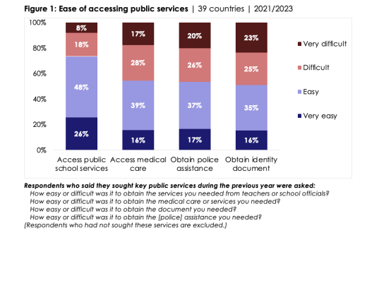 • On average across 39 countries, substantial proportions of the adult population say they had contact with a public health care facility (58%), a public school (34%), and/or a government agency that provides identification documents such as a birth certificate, driver’s licence, passport, or permit (33%). More than four in 10 (45%) say they requested police assistance, encountered the police in other situations, or both.
