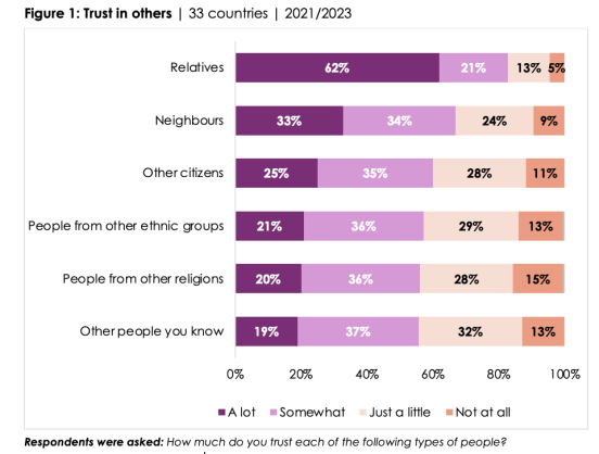 Based on data from 33 African countries surveyed in 2021/2023, the new report shows that most citizens have no objection to living next door to people from different ethnic backgrounds and are open to interethnic marriages within their own families. However, many express low levels of trust in people from other ethnic groups as well as in people from other religions and outsiders beyond family and community networks.