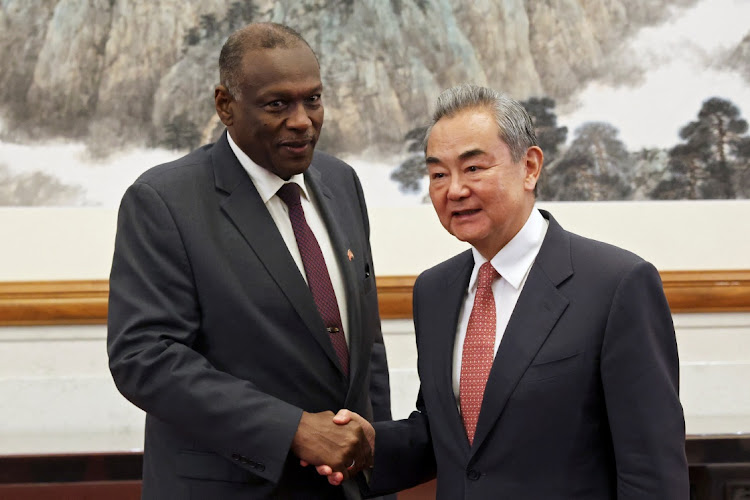 Chinese foreign minister Wang Yi shakes hands with Omar Seddik, Sudan’s newly appointed foreign minister, before their meeting at the Diaoyutai State Guesthouse in Beijing, China, on May 14 2025.