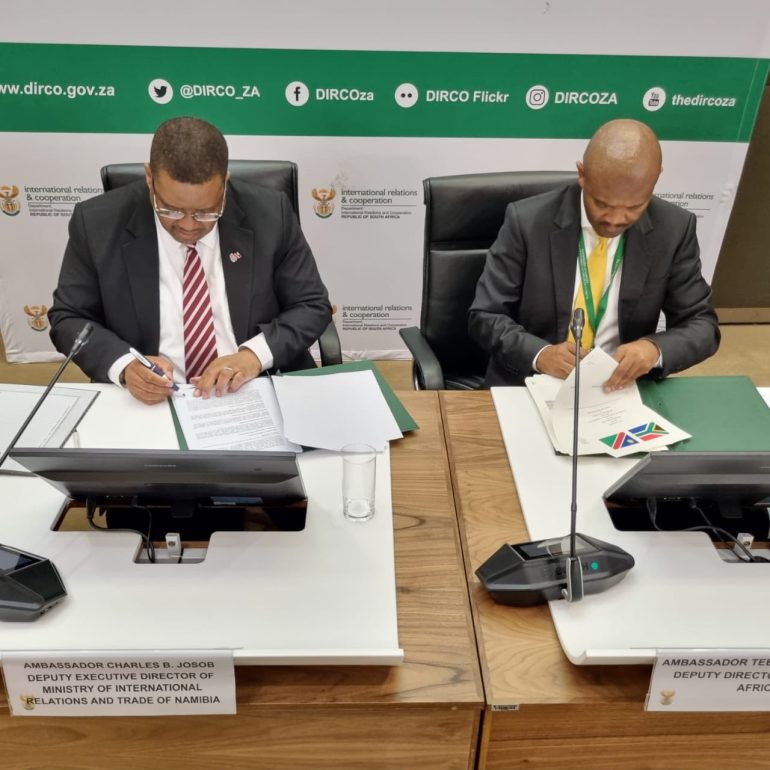 Omutumba go Mid Term Review of the Third Session of Namibia-South Africa Bi National Commission ogweya pehulilo neshaino lyo Agreed Minutes of the Mid Term Review ,ku ambassodor Tebogo Seokolo,omupevi kuluntu ndjayi goshitayi sha Africa moshikondo shiipambele yopashigwana nelongelokumwe mo South Africa, na Ambass Charles B Josob,ngoka ta kwathele onga omukuluntu wiliki guuministeli wiikwapondje yoshilongo niipindi mo Namibia ohela mo Pretoria sha South Africa.