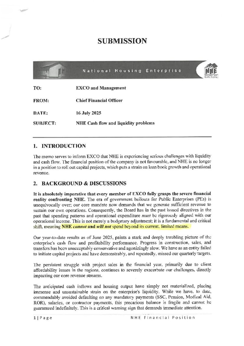 insert_link Uncategorized NHE facing cash flow and liquidity challenges By: Josia Shigwedha A leaked internal letter has revealed that the National Housing Enterprise (NHE) is facing a severe cash flow and liquidity crisis, prompting the institution to implement sweeping cost-cutting measures aimed at stabilising its financial position. The confidential communication, seen by this media house reveals that the company has enforced urgent interim measures to mitigate the crisis, including sharp reductions in travel, accommodation, and event hosting expenditures. The […] today25 July, 2025