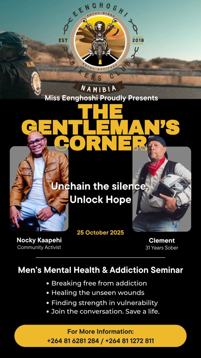 insert_link Namibia Biker’s club pageant queen pioneers men’s mental health seminar By: Ellen Shihepo The Eengoshi Biker Club's Ms Eengoshi 2025, Motjaritje Tjamuaha (26) is advocating for men's mental health through a seminar set to take place on Saturday the 25th of October in Windhoek under the theme "Unchain the Silence, Unlock the Hope". Tjamuaha said the initiative aims to create a safe space for men to discuss issues such as suicide, addiction, domestic violence, vulnerability and healing. "Due to the […] today23 October, 2025