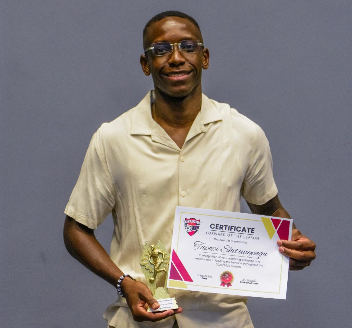 insert_link Namibia Tapopi Shetunyenya honoured at City Boys FC awards By: Petrus Amutenya City Boys FC celebrated its standout players for the 2024/2025 season in a ceremony held in Windhoek this September. Forward Tapopi Shetunyenya walked away with two awards for his exceptional performances, including a pivotal role in the club’s triumph in the Khomas second division league and the Mariental playoffs. The wins secured City Boys FC a place in the first national division league. Shetunyenya expressed gratitude […] today7 October, 2025