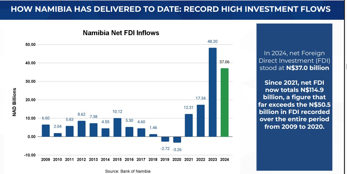 insert_link Uncategorized Namibia’s FDI inflows decline in 2024 despite sectoral growth in mining and transport By: Hertha Ekandjo Namibia’s net foreign direct investment (FDI) inflows declined by 23.1 percent in 2024 compared to the previous year, according the latest FDI report launched on Wednesday in Windhoek. The decline is primarily attributed to a high base effect in 2023, driven by the disposal of foreign assets in the manufacturing sector and reduced inter-company borrowing in the mining industry. The report noted that, despite the overall drop […] today15 May, 2025