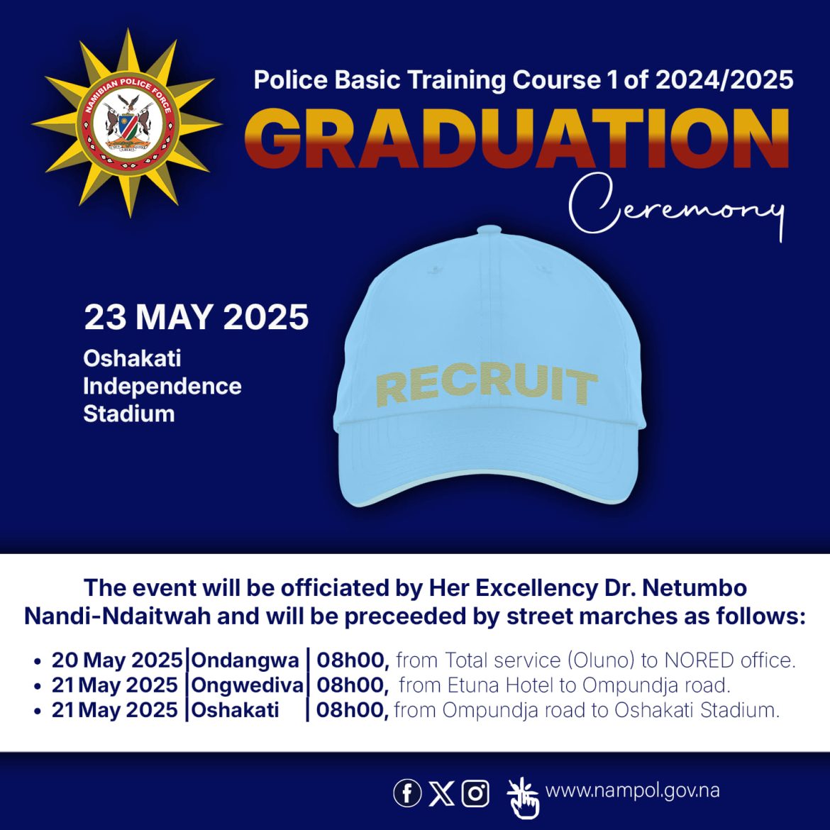 insert_link Oshiwambo Opolisi yoshilongo okwa tegelelwa yi ninge oshituthi pito shawo shotango shomumvo 2024-2025 kOshakati Stadium etitano ndika Oshituthi piti moka oo cadet constables 1 800 tadhi ka wayimina opolisi,otashi ka patululwa komupresitend Netumbo Nandi Ndaitwah ,shiikwatelela komupopiliko gopolisi Kauna Shikwambi nena. Shikwambi tati aanambelewa mboka yonkatu yuu cadets oya manitha omadheulo gawo goomwedhi 9 ko Pius Joseph Kaundu Ruben Danger Ashipala noko Simon Mutumba Police Training Centres. Shikwambi tiindiile oshigwana shika kale oombangi poshituthi piti shoka tashi ka ningwa kohi yehuku:.Together We Stand: Empowered for a Safer […] today19 May, 2025