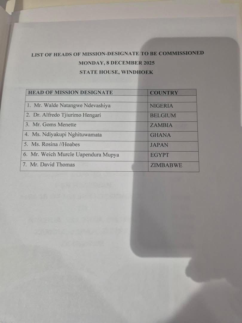insert_link Oshiwambo Aakuluntu aape yomatumo oya tseyithwa nena Omupresident Netumbo Nandi Ndaitwah nena okwa kwatele komeho euliko lyaakuluntu yomatumo mboka taaka kalelapo oshilongo ko Nigeria,Belgium,Ghana,Zambia,Japan,Egypt noko Zimbabwe. Ta popi poshituthi,omupresident okwa nongele kutya nonando omatumo guuna diplomate ga Namibia omashona ngele tashiya koonzo dhopantu,oguulika oondjele dhili pombanda dhiilonga. Yuulikwa oyo:Walde Natangwe Ndevashiya tayi ko Nigeria,Alfredo Hengari tayi ko Belgium,Goms Mennete tayi ko Zambia,Ndiyakupi Nghituwamhata tayi ko Ghana,Rosina Hoabes tayi ko Japan,Weich Murele Uapenderua Mupya,tayi ko Egypt,na Davi Thomas […] today8 December, 2025